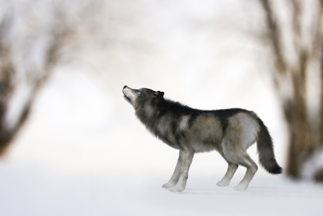 一部のミアキスは森から草原に出て暮らすようになり、4130万年前~3780万年前のヘスペロキオン、約2,400万年前 – 2,000万年前のキノデスムス、1500万年前のトマークタスなどに進化したと言われています。木に登る必要がなくなったのでカギ爪は引っ込めることが出来ない爪になり、体形も今のハイエナのような姿になりました。 トマークタスからはやがてキツネやタヌキ、オオカミなどのイヌ科が現れ、北アメリカからベーリング海峡を渡り、ユーラシア、アフリカへ広がっていきました。オオカミはさらに隠れる場所が少ない草原で大きな草食動物を餌とするために早く走る脚力を身につけ、集団で狩りをするようになり、吠えて仲間同士でコミュニケーションをとるように進化したと考えられます。